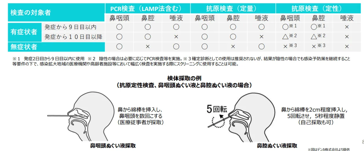 - 検体の取り方は、以前は鼻咽頭(鼻の奥)ぬぐい液だけだったが、今は鼻腔(鼻の穴の手前側)ぬぐい液だったり、唾液も状況によっては使える。
