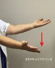 4.30秒から1分くらいやって、もし下の写真のように手が下がる場合は麻痺があります。