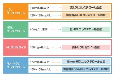 血液中の脂質の値が基準値から外れた状態を、脂質異常症といいます。