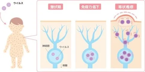 心身ともに健康であればこのウイルスが再び活性化することはないのですが、加齢や過労、ストレスなどで免疫力が低下すると、免疫で抑えることができなくなり、潜伏していたウイルスが活性化してしまいます。
