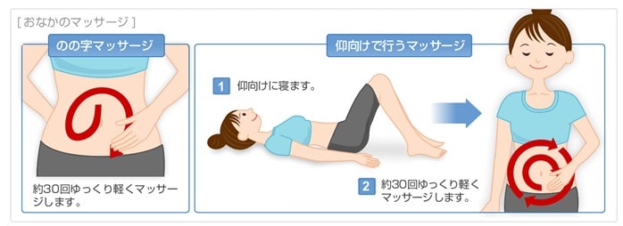 大腸を外部から刺激することで蠕動(ぜんどう)を促すことができるため、腹部のマッサージや、腸の緊張を抑えるため、刺激の少ない食べ物をとりましょう。